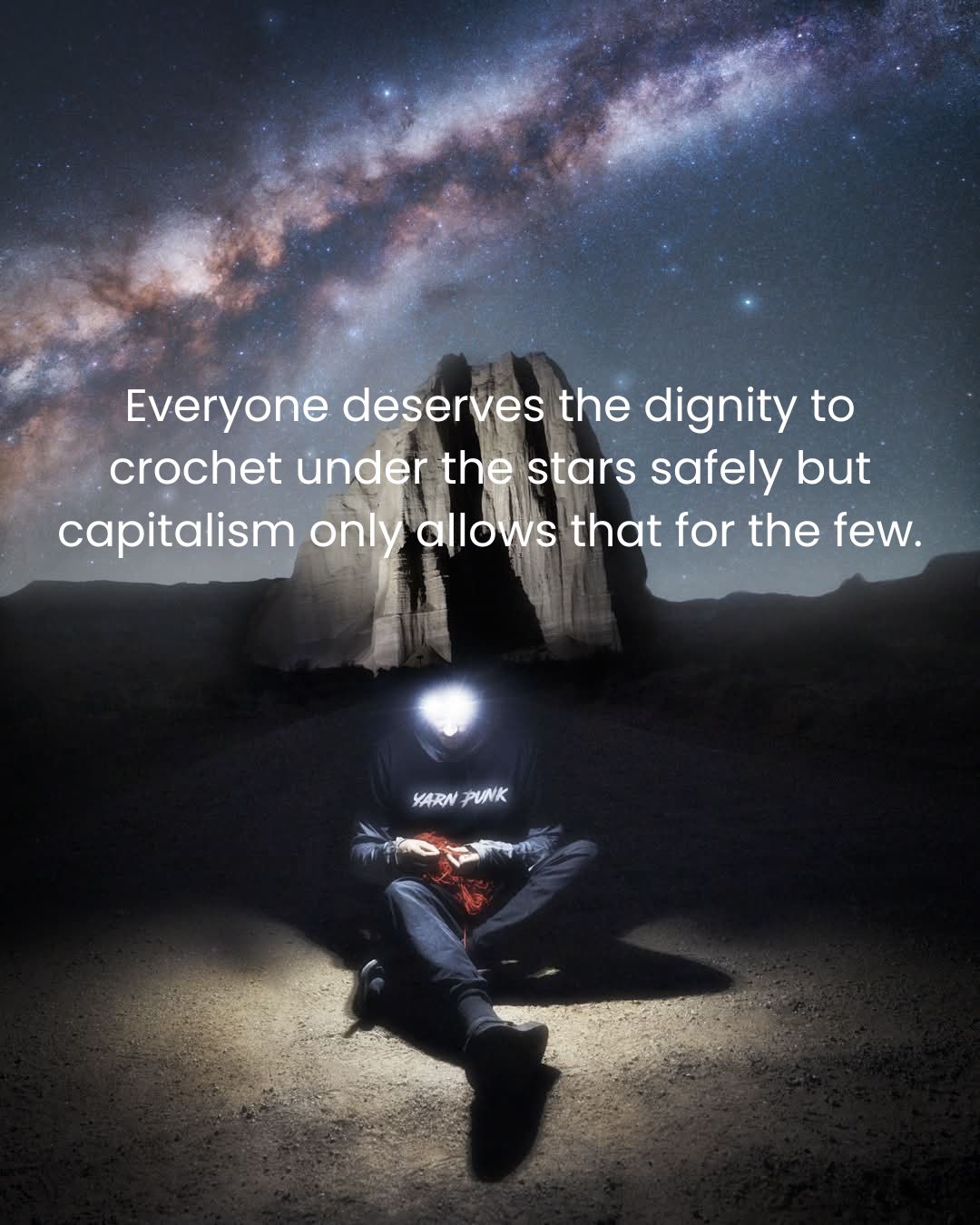 Everyone deserves the dignity to crochet under the stars safely but capitalism only allows that for the few.